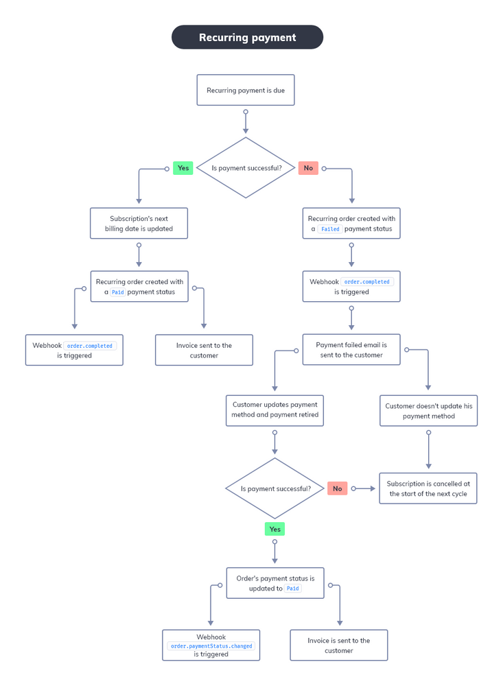 Les abonnements seront facturés sur la base du calendrier prévu. Chaque paiement récurrent créera une commande dans le tableau de bord. Lorsqu'un paiement récurrent échoue, le client en est informé et doit mettre à jour sa méthode de paiement pour régler le solde restant. Un abonnement non payé sera automatiquement annulé à la prochaine date de facturation.