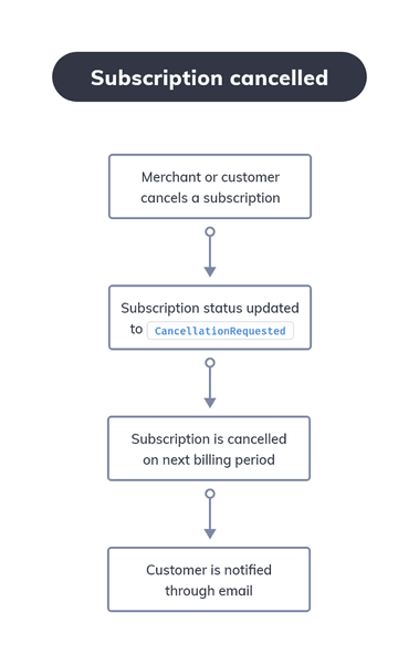 Un abonnement peut être annulé par le commerçant via le tableau de bord du commerçant ou par le client directement dans le tableau de bord client. Lorsqu'un abonnement est annulé, l'état de l'abonnement est défini à CancellationRequested, l'abonnement restera actif jusqu'à la prochaine date de facturation. L'état sera alors changé en Cancelled. Il est important d'en tenir compte si vous ajoutez de nouvelles fonctionnalités à la nôtre.